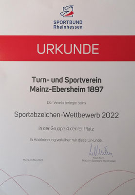 Nach dem der TSV Ebersheim letztes Jahr zum ersten Mal das Sportabzeichen im Verein abgenommen hat, sind wir um so stolzer, dass es in der Gruppe 4 (Vereine in Rheinhessen mit mehr als 900 Mitglieder) des Sportabzeichen-Wettbewerbs 2022 zu einem guten 9. Platz gereicht hat. Da wir unter die ersten 10 Vereine in Rheinhessen gekommen sind, wurden die Leistungen all unserer fleißigen Athleten nicht nur mit einer Urkunde des Sportbund Rheinhessen, sondern auch mit einer kleinen finanziellen Zuwendung honoriert.