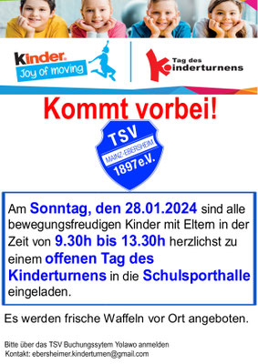 Im April 2023 fand zum ersten Mal „kinder Joy of Moving Tag des Kinderturnens“ beim TSV Ebersheim statt. Am Sonntag, den 28. Januar 2024 öffnet der Verein von 9:30 bis 13:30 nun ein zweites Mal die Turnhalle. Kinder ab 3 Jahren dürfen teilnehmen.