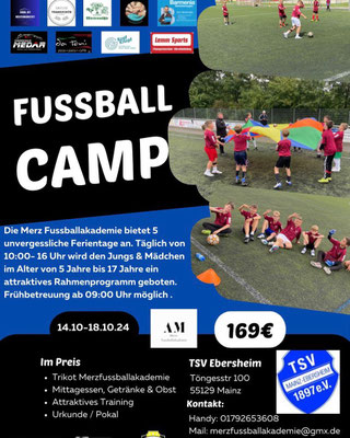 Der TSV Ebersheim, in Kooperation mit der Merz - Fussballakademie, veranstalten vom 14.10. - 18.10.2024 ein fünftägiges Fußballcamp im Ebersheimer "Kesseltal".