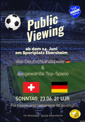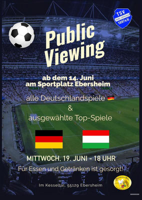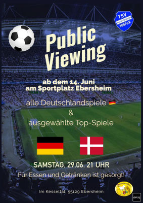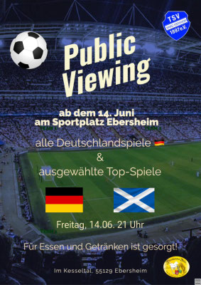 wir möchten euch darüber informieren, dass der TSV Ebersheim, ab dem 14.06. auf dem Sportplatz im Kesseltal für alle Deutschlandspiele und ausgewählte Top-Spiele Public Viewing anbieten wird. Die entsprechenden Spiel werden hier zeitnah bekannt gegeben.