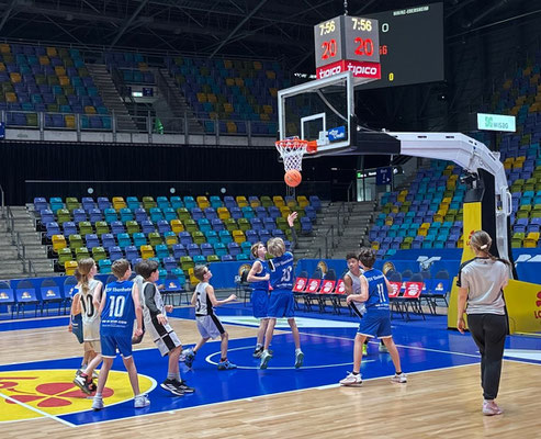 Im ersten Spiel gegen die BG Ober-Ramstadt spürte man noch die Aufregung, schließlich haben wir auf dem heiligen Original-Court der Skyliners in einer gefühlt riesigen Halle das erste Mal auf Körbe in Erwachsenenhöhe spielen müssen. Der Gegner forderte einiges von unseren Kindern ab, aber wir siegten schließlich mit 10:9.